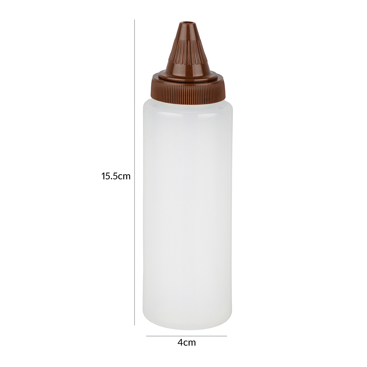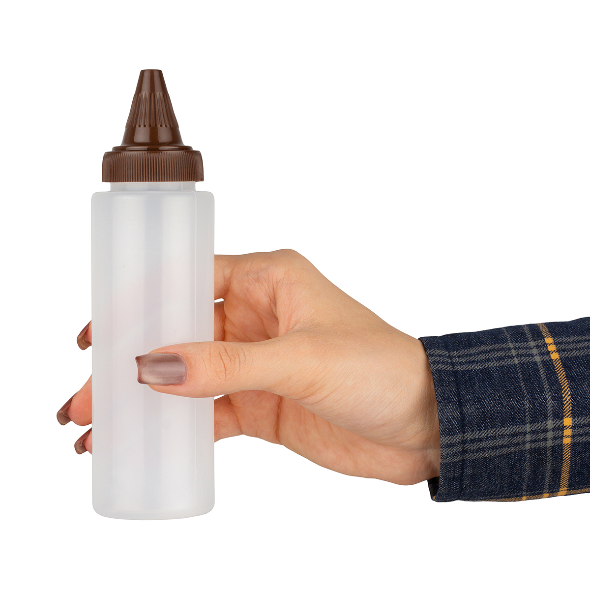 بطری پلاستیکی 150 سی سی تک با وزن 23 گرم ارتفاع 15/5 سانتیمتر و قطر 4/3 سانتیمتر از مواد نو پلی پروپیلن ساخته شده است . این مدل بطری پلاستیکی بدلیل داشتن درب قفل شو که دارد بهترین انتخاب برای دلیوری و ارسال انواع سس ، روغن ، آبلیمو ، عسل ، رب انار ، شیره انگور و انواع مایعات میباشد